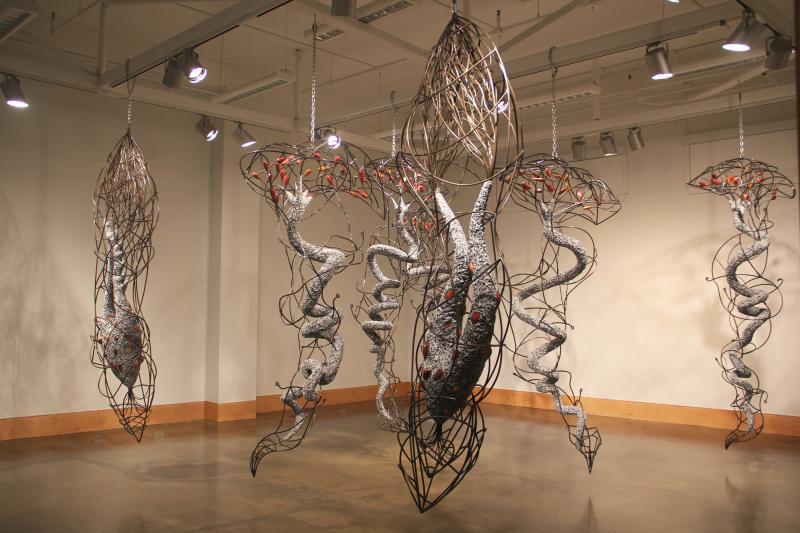 The La Strega (2014-2015) series reflects tumultuous events that happen with the ferocity and randomness of storms, as, for example, the women tortured and hanged during the Salem witch trials in 1692, for alleged participation in satanic rituals. Another example is the Inquisition during the Renaissance and later when supposed heretics were tortured. Graceful in configuration, the works reflect feminine beauty, but areas of twisted and mangled steel convey the inner tumult of the victims. The thirteen drawings in the show titled Witch Hunt echo the ideas of the sculptures, at the same time that they serve as an incubation for ideas for the three-dimensional works.